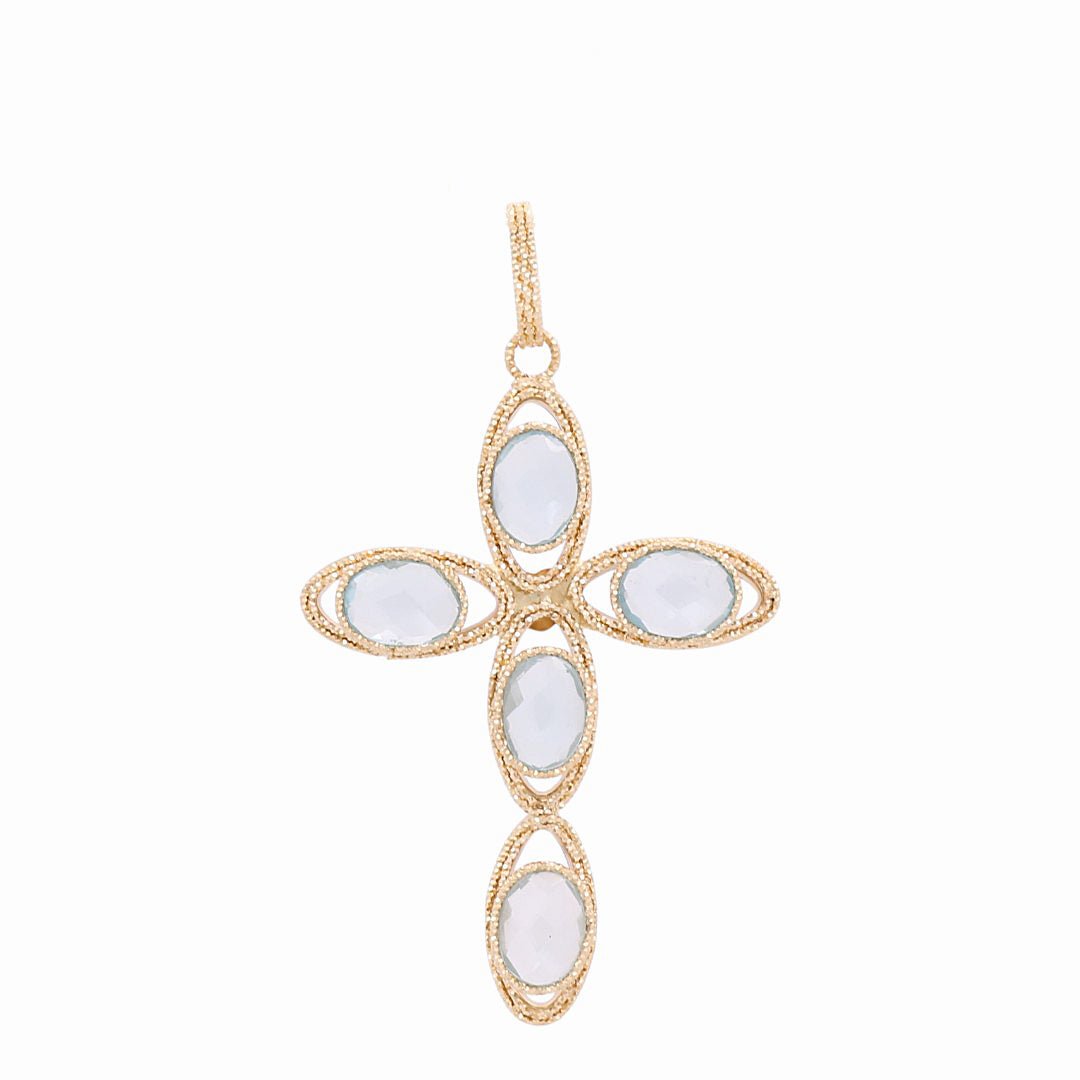 Celebrate your unique style with this dazzling pendant. The intricate diamond cut design adds sparkle and shine to any outfit, and the light blue stones bring a touch of elegance and charm. Made of high-quality 14K yellow gold, this pendant is a timeless investment that will elevate any jewelry collection. Add it to your wardrobe and make a statement every day!
