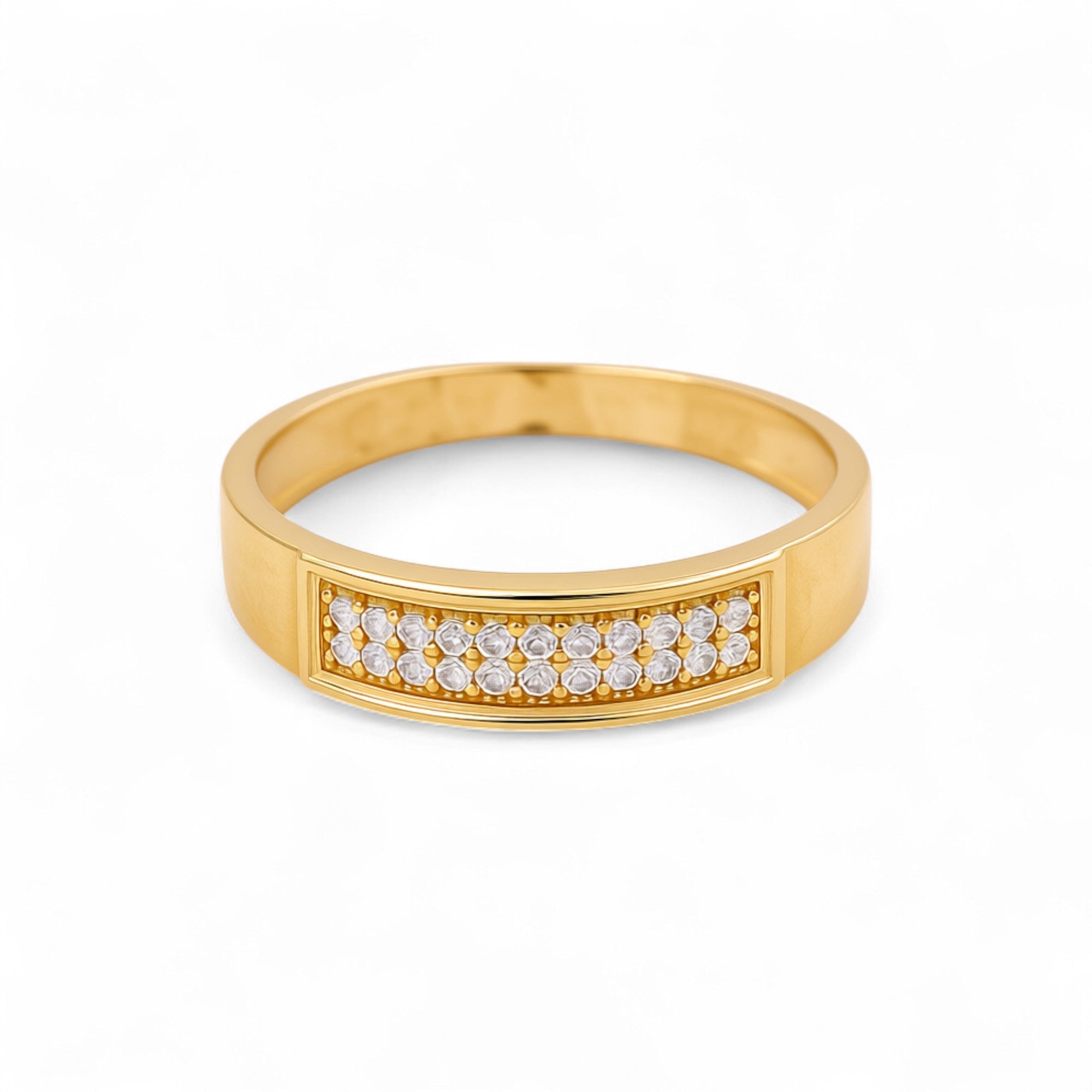 Radiate elegance with this stunning 14K yellow gold wedding band adorned with brilliant cubic zirconia accents. Crafted from premium 14K gold, this band merges timeless sophistication with sparkling gemstone detail that catches light from every angle. The lustrous yellow gold provides a warm, luxurious foundation, while the carefully set cubic zirconia stones add dimension and brilliance to your bridal look. Built for everyday wear, the substantial gold composition resists scratching and maintains its radiant finish through years of cherished moments. Whether worn alone as a statement piece or layered with an engagement ring, this band offers versatile styling options for any aesthetic. An exceptional choice for those seeking authentic gold quality enhanced by eye-catching sparkle—a wedding band that celebrates both timeless elegance and contemporary glamour.