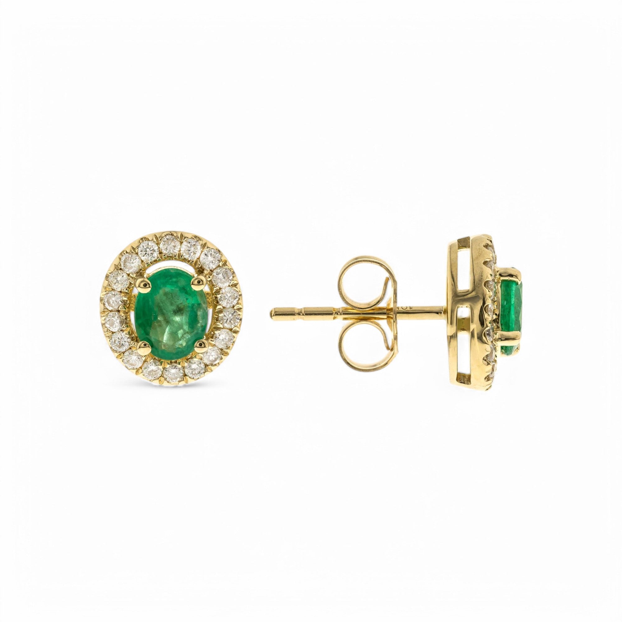 14K Yellow Gold Stud Diamond Earrings with 0.67Tw Oval Emeralds 0.18 Tw Round Diamonds
