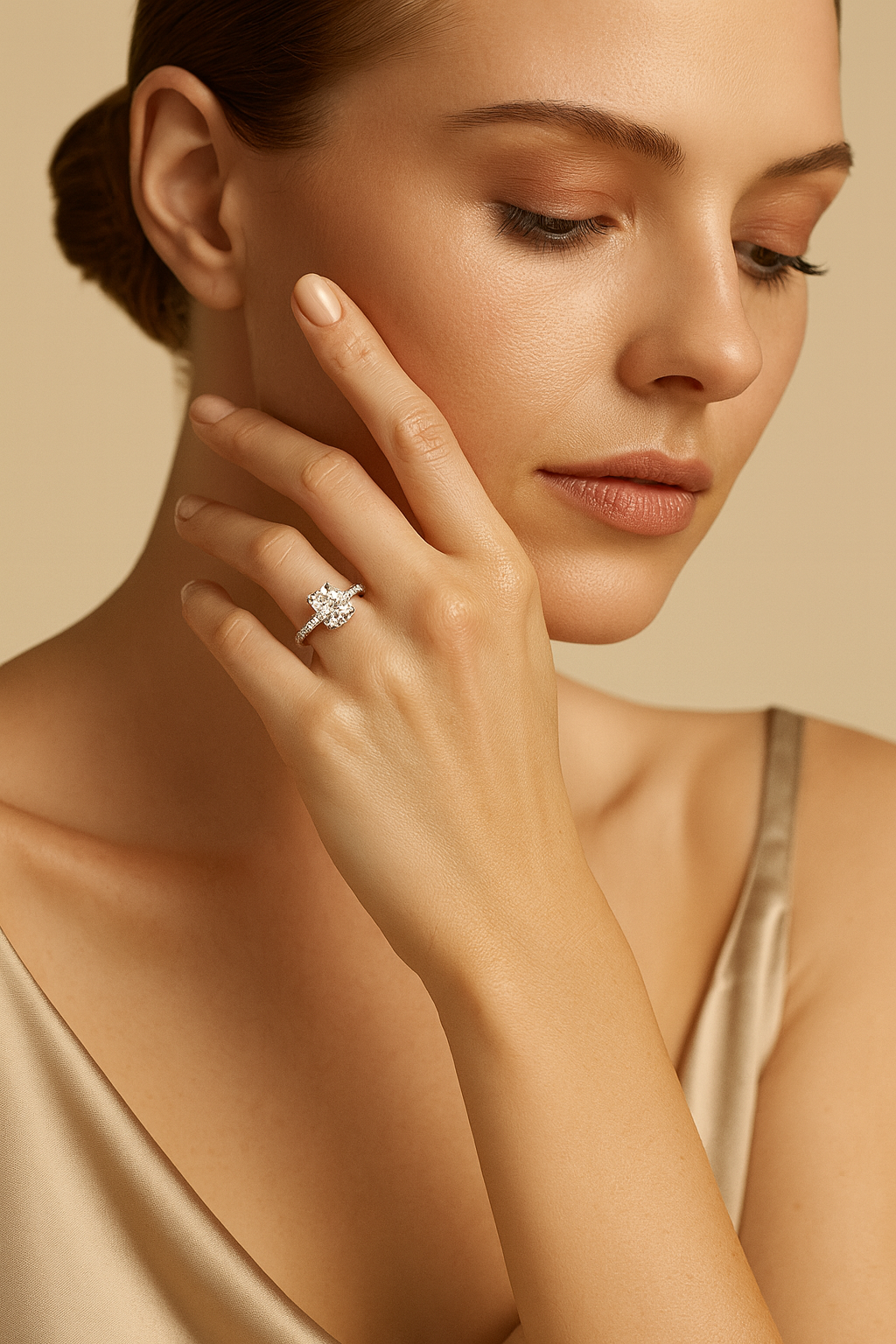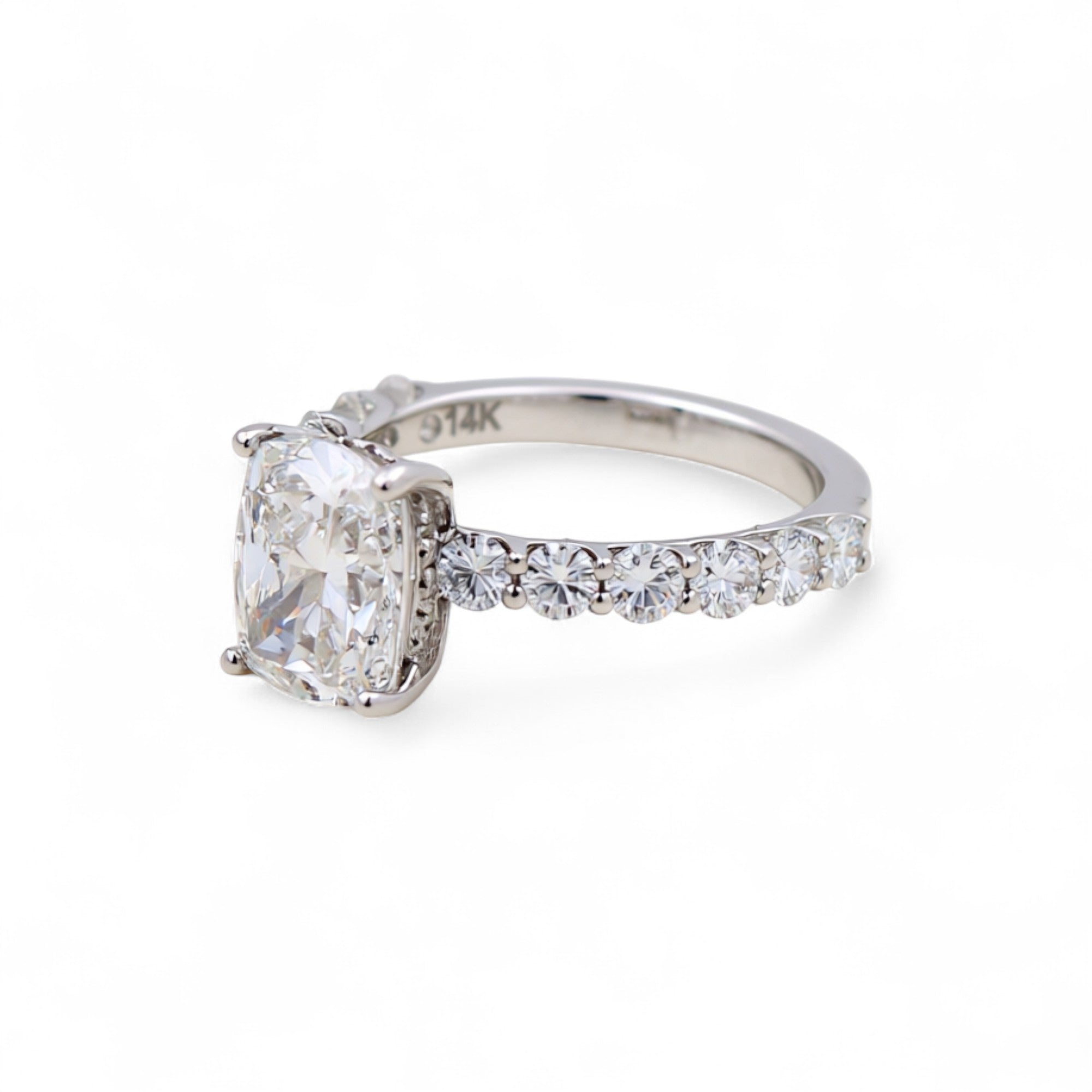 Discover refined elegance with this exquisite 14K white gold solitaire ring, showcasing a magnificent 2.44-carat emerald-cut lab diamond that commands attention with its sophisticated geometry and brilliant sparkle. Surrounded by complementary round lab diamonds, this piece strikes the perfect balance between classic design and contemporary allure. Lab diamonds deliver the same optical properties and durability as mined diamonds while offering remarkable value and ethical sourcing you can feel confident about. The pristine white gold setting amplifies the diamond's luminosity, creating an enchanting play of light that transforms with every movement. Perfect for those seeking a statement ring that combines timeless beauty with smart luxury, this design promises to be a cherished heirloom for years to come.