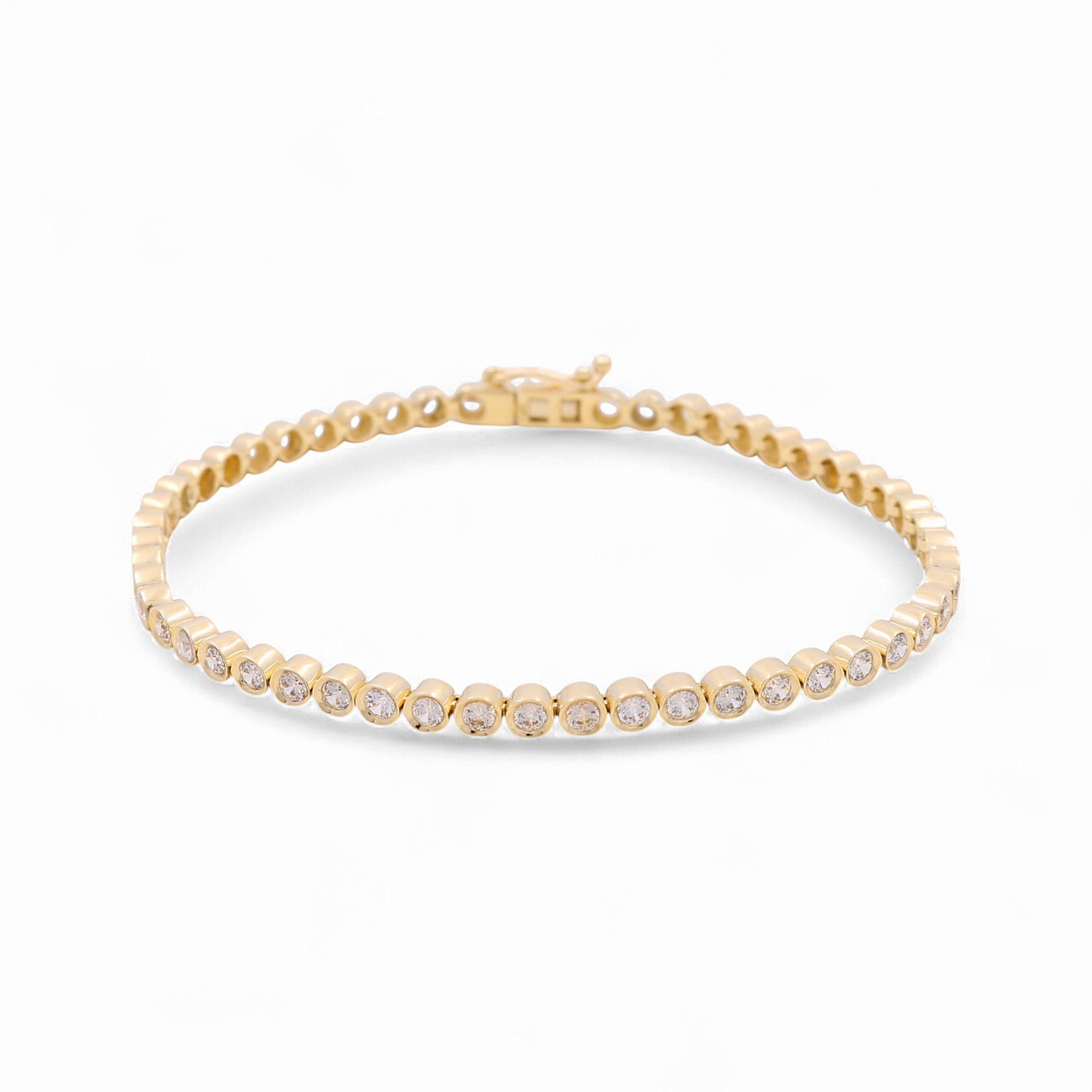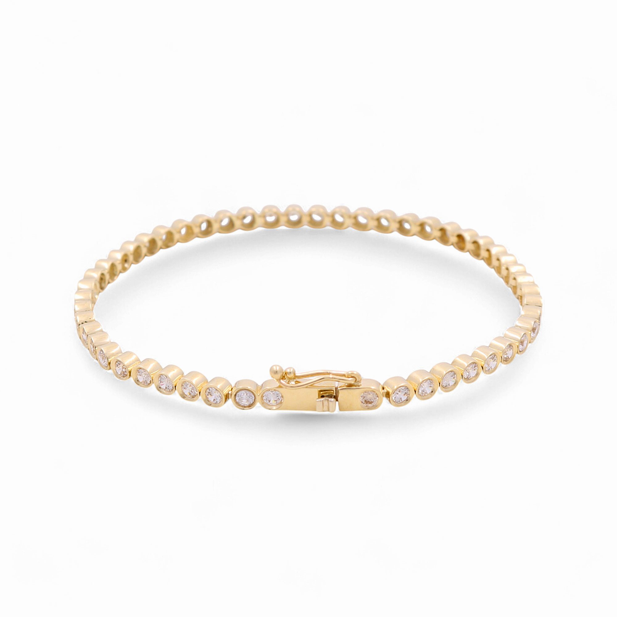 Dazzle and shine with this stunning 14K yellow gold tennis bracelet, adorned with sparkling CZ stones. Elevate any outfit with the luxurious touch of gold and the glimmer of diamonds. Make a statement and feel confident with this timeless piece of jewelry.