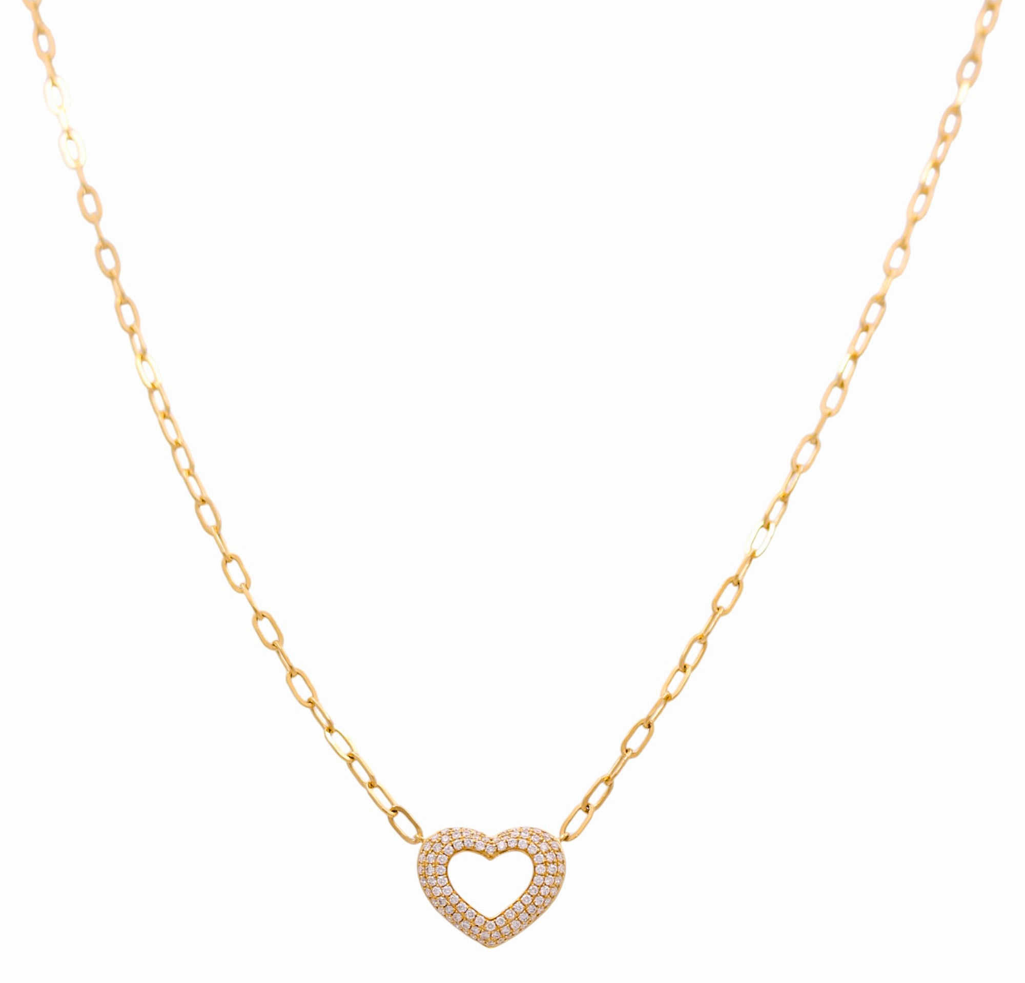 Elevate your jewelry collection with this stunning 18k yellow gold paper clip necklace, featuring a delicate heart-shaped pendant adorned with 0.69 total carats of brilliant round diamonds. The unique paper clip design adds a modern twist, while the sparkling diamonds bring timeless elegance and sophistication. Perfect for everyday wear or special occasions, this necklace effortlessly enhances any outfit with a touch of luxury and heartfelt charm. Make a lasting impression with a piece that combines contemporary style and classic beauty.