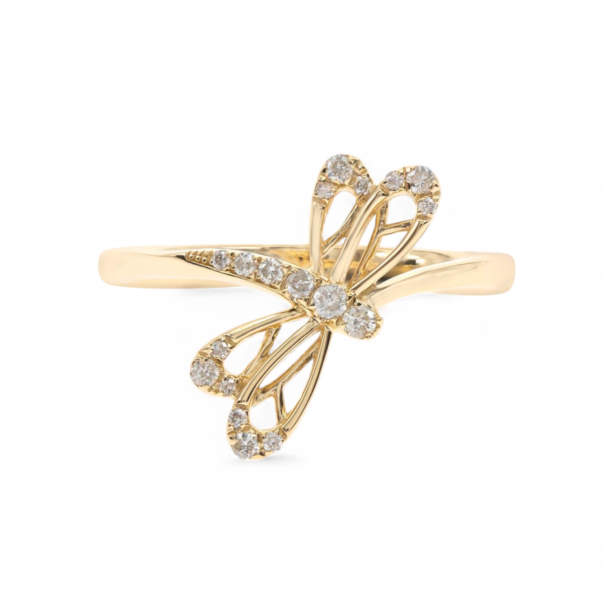 Fall in love with this exquisite dragonfly diamond ring! The stunning 14K yellow gold and dazzling 0.14 carat round diamonds make it a must-have accessory. Elevate your style and let your inner fashionista shine with this elegant piece!