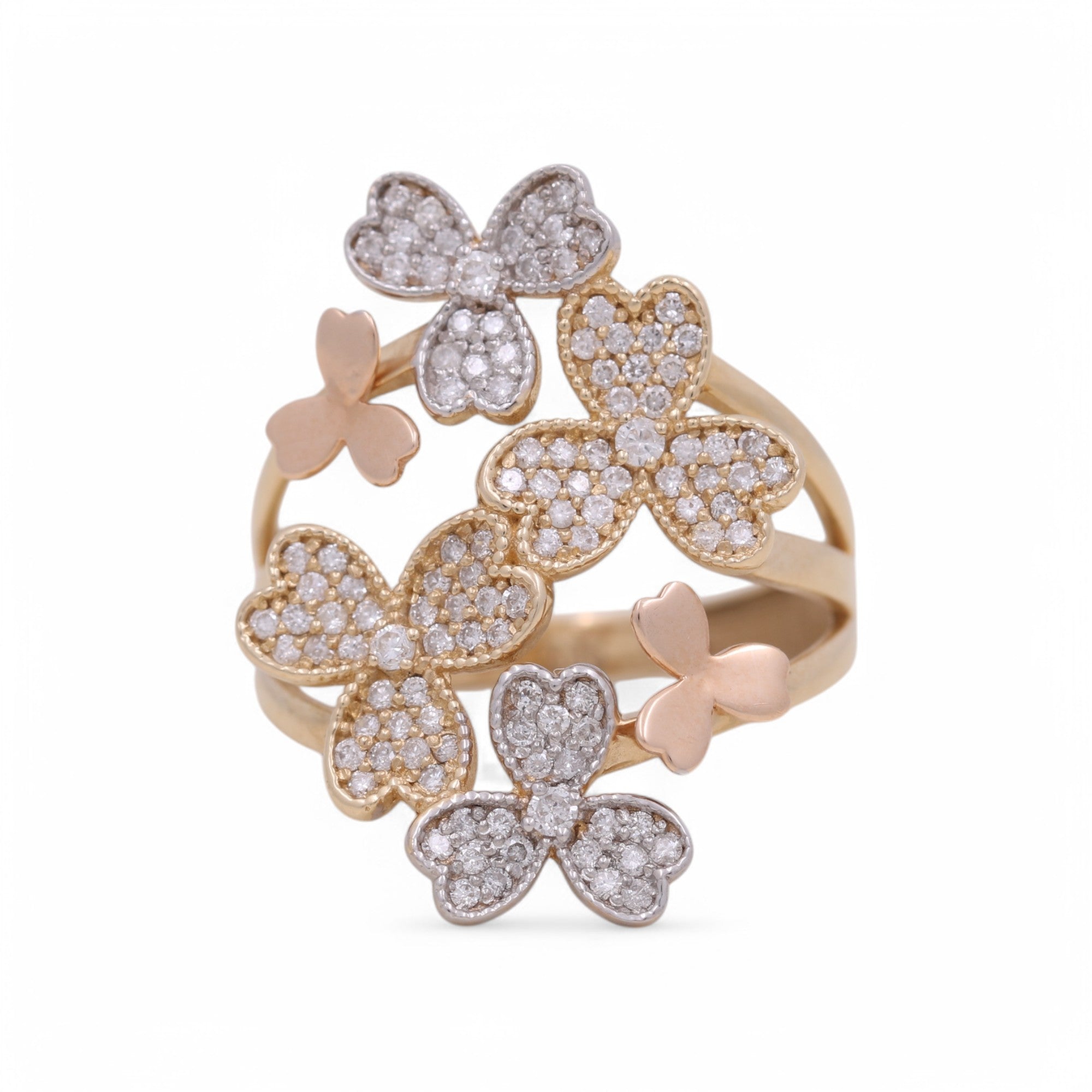 14K Tri Color Gold Flowers Fashion Ring with 0.62Tw Round Diamonds