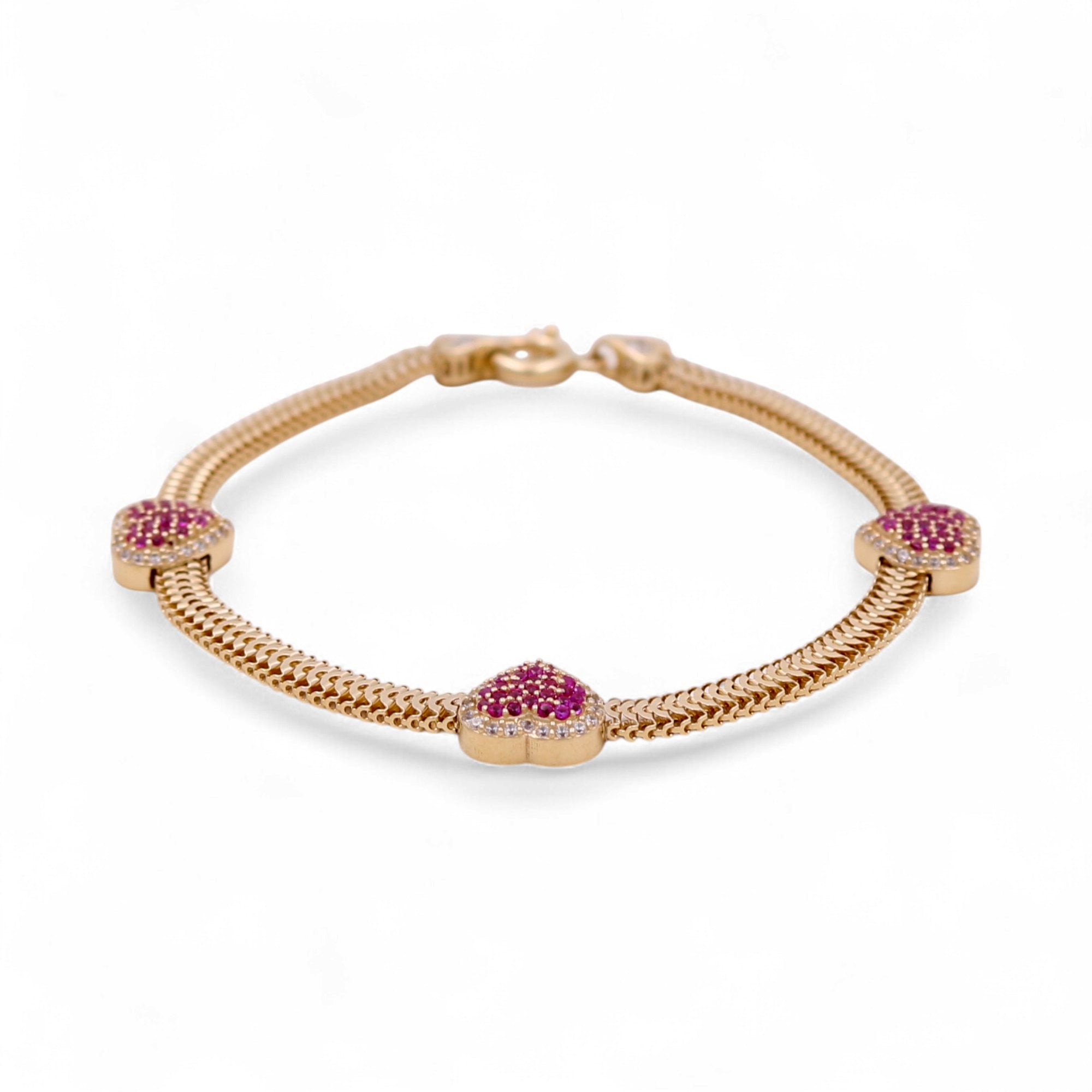 14K Yellow Gold Fashion Link Women's Bracelet Hearts with Pink Cz