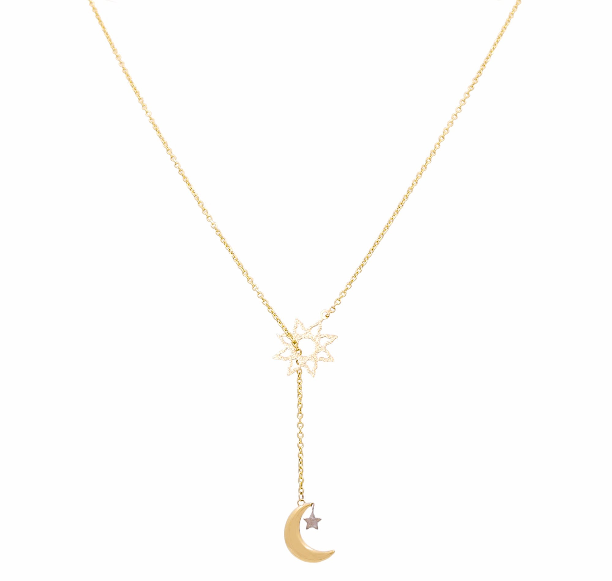 Experience the beauty of the sun and moon with our 14K Yellow Gold Sun and Moon Necklaces. These stunning pieces add a touch of celestial charm to any outfit, making you feel connected to the natural world and its infinite possibilities. Crafted with high-quality gold, these necklaces are a symbol of luxury and refinement. Elevate your style and harness the power of the sun and moon with our exquisite necklaces.