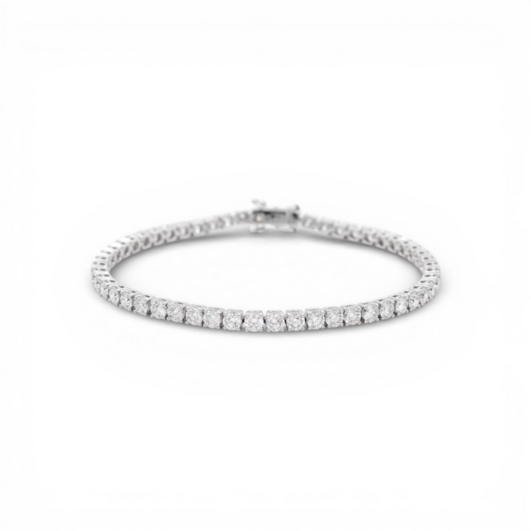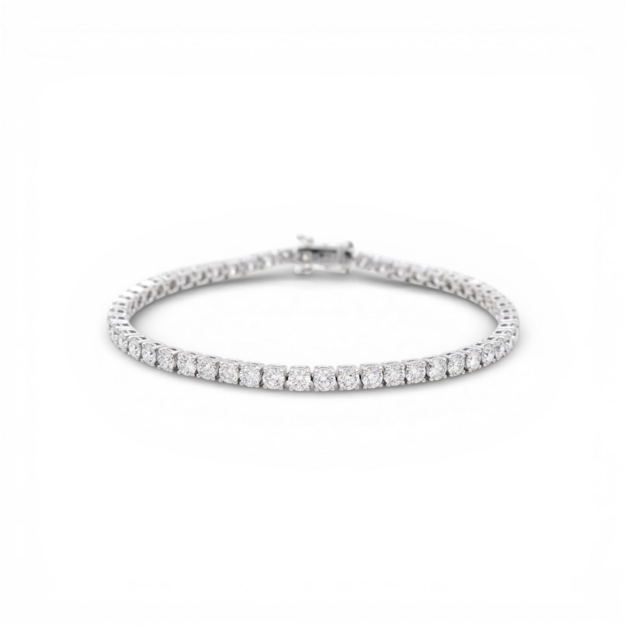 Elegant 14K white gold tennis bracelet featuring 6.73 carats of round lab-grown diamonds in a classic four-prong setting. Each stone is precisely aligned for a seamless sparkle that catches light from every angle. The secure clasp and flexible design ensure comfortable all-day wear, whether for special occasions or everyday luxury. Lab diamonds offer exceptional brilliance and clarity at a responsible value.