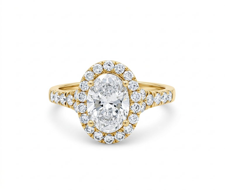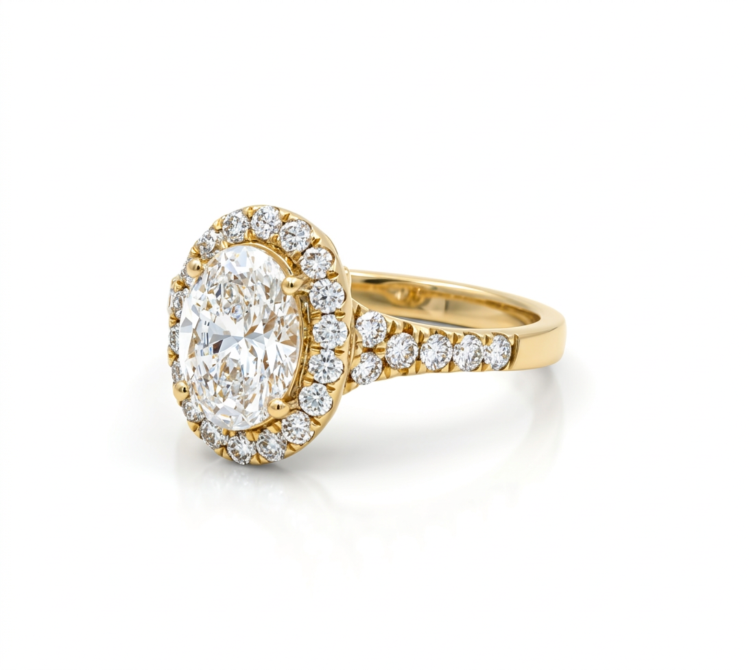 Elegant 14K yellow gold oval ring featuring a stunning 1.50 carat oval lab diamond as the centerpiece, complemented by 0.61 carats of brilliant round lab diamonds set along the band. Lab-grown diamonds offer exceptional clarity and sparkle with sustainable sourcing. The warm glow of yellow gold enhances the diamond's natural beauty, creating a timeless piece perfect for engagements, anniversaries, or special occasions. Each ring is crafted with precision to ensure lasting brilliance and comfort for everyday wear.