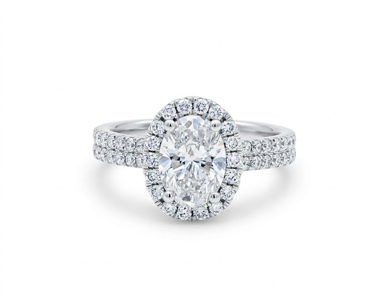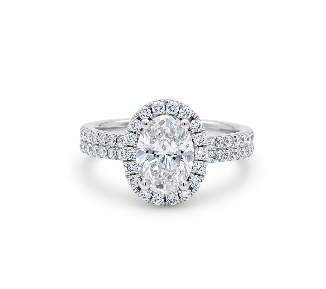 Discover refined elegance with this 14K white gold oval ring, showcasing a luminous 1.50 carat oval lab diamond in a graceful setting. Enhanced by 0.78 carats of sparkling round lab diamonds, this design delivers sophisticated beauty with understated luxury.