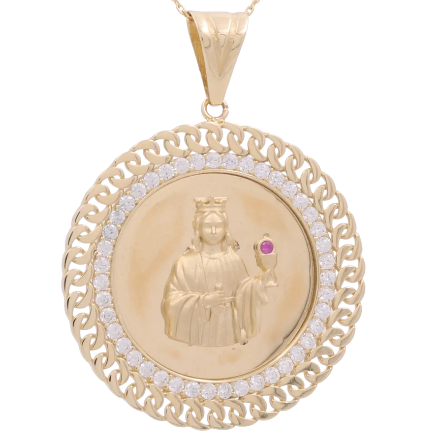 Close-up of the Miral Jewelry 14K Yellow Gold Round Religious Pendant with Zirconias, featuring an engraved figure holding an orb. The circular pendant boasts a decorative chain-like border embedded with small zirconias.