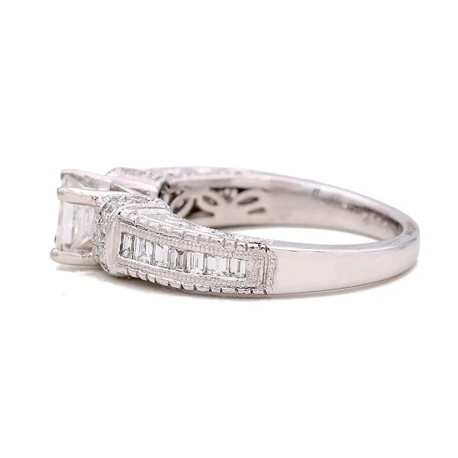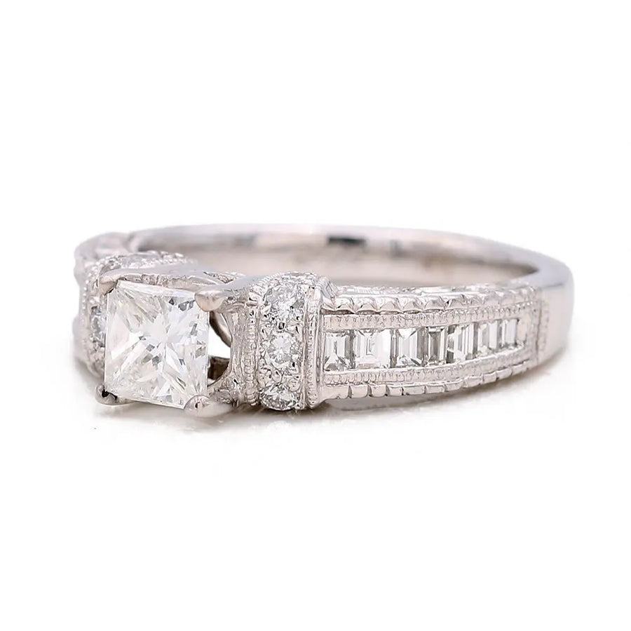 Indulge in the ultimate symbol of love and commitment with our stunning White Gold 14k Statement Diamond Engagement Ring. Featuring a sparkling 0.72Tw Princess Diamond and 0.58Tw Various Shapes Diamonds, this exquisite ring is the perfect blend of elegance and luxury. Make a statement that will take your breath away and leave you feeling truly cherished. Embrace the moment and let our ring be the embodiment of your everlasting love.
